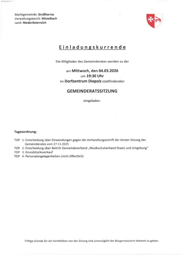Herzliche Einladung zur Gemeinderatssitzung am Mittwoch, 4.3.2026, 19:30 im Dorfzentrum Diepolz.